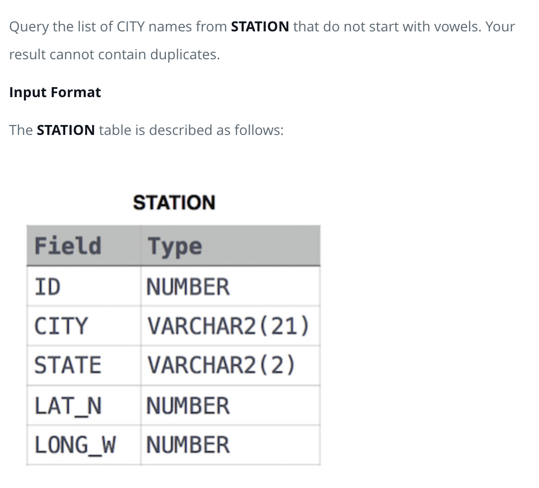- '도시명이 모음으로 시작하지 않는' 조건을 만족하는 도시들만 조회하면 된다.
