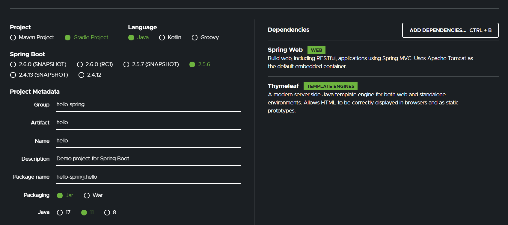 다음과 같이 설정 후 generate를 클릭합니다. 최근에는 Maven 프로젝트보다 Gradle 프로젝트를 사용하는 추세여서 Gradle을 선택했습니다. Dependencies로 Spring Web과 Thymeleaf를 가져옵니다. 스프링 부트는 괄호가 안붙은 버전을 선택합니다. 괄호가 붙은 버전은 안정화된 버전이 아니므로 사용하지 않습니다.