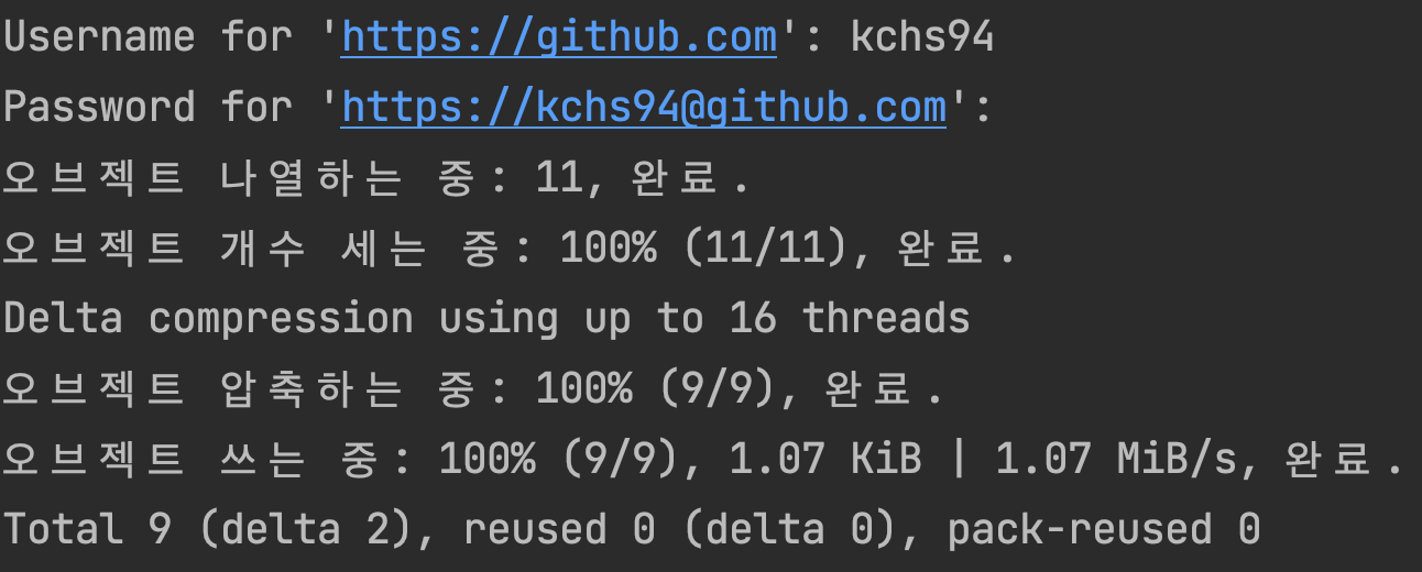 비밀번호가 아닌 personal access token을 발급받은 뒤 비밀번호 대신 입력을 해주면 정상적으로 코드가 올라간다.