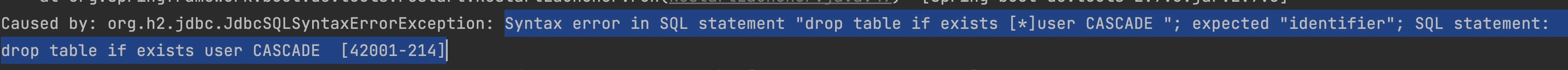 Syntax error in SQL statement "drop table if exists [*]user CASCADE "; expected "identifier"; SQL statement:drop table if exists user CASCADE [42001-214]