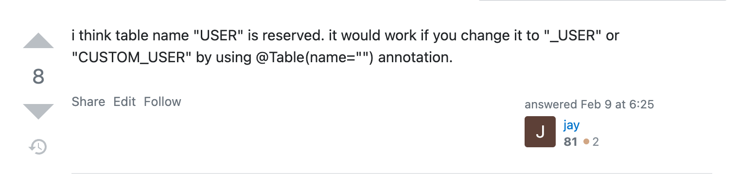 그러면 예약어를 피하기 위해 USER 테이블 명을 바꿔야 하는데 엔티티 클래스명을 바꾸기 보다는 @Table(name="UERS")를 이용하여 테이블 명을 USERS로 바꿨다.