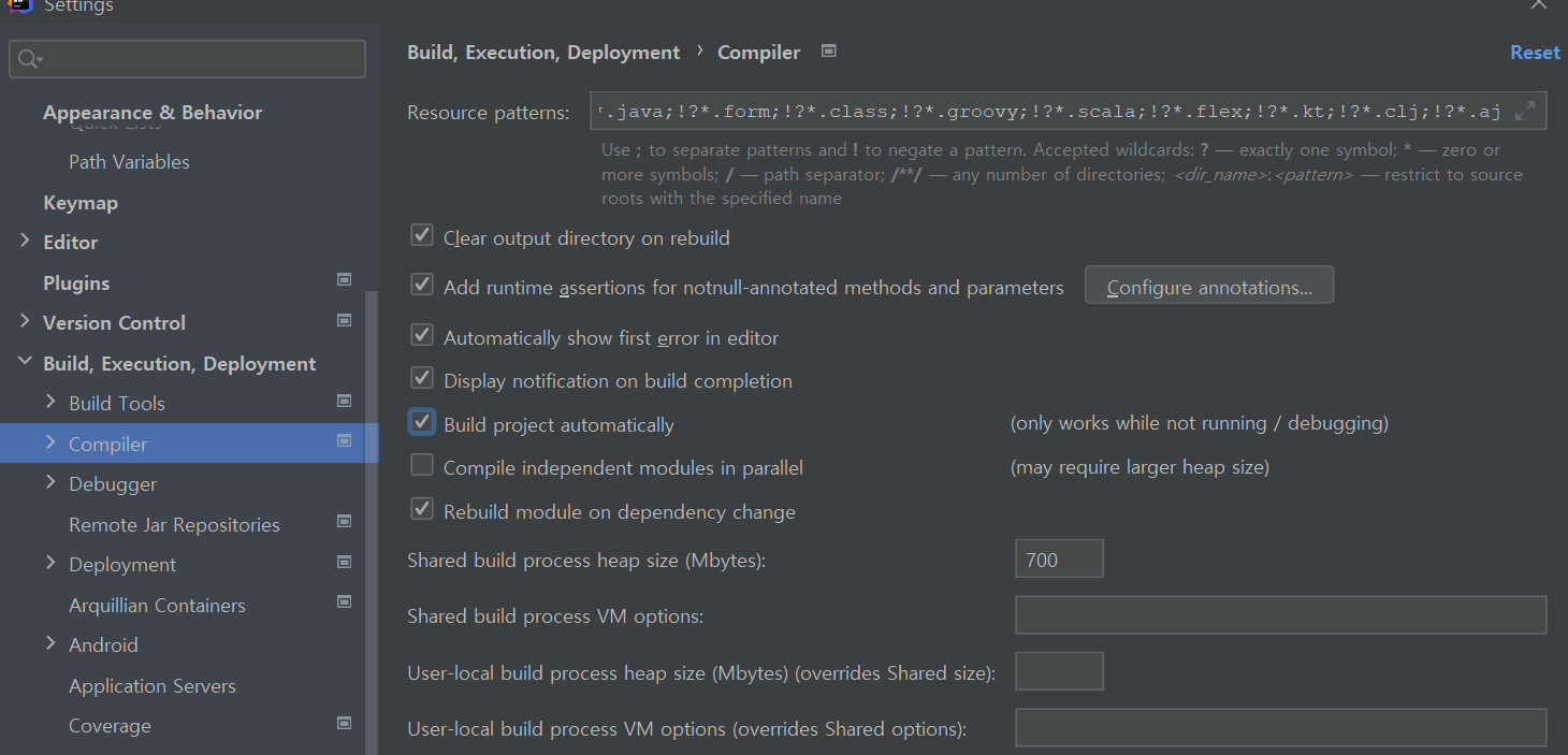 - File - Setting - Build, Execution, Deployment - Compiler 들어가서 Build project Automatically 적용하기